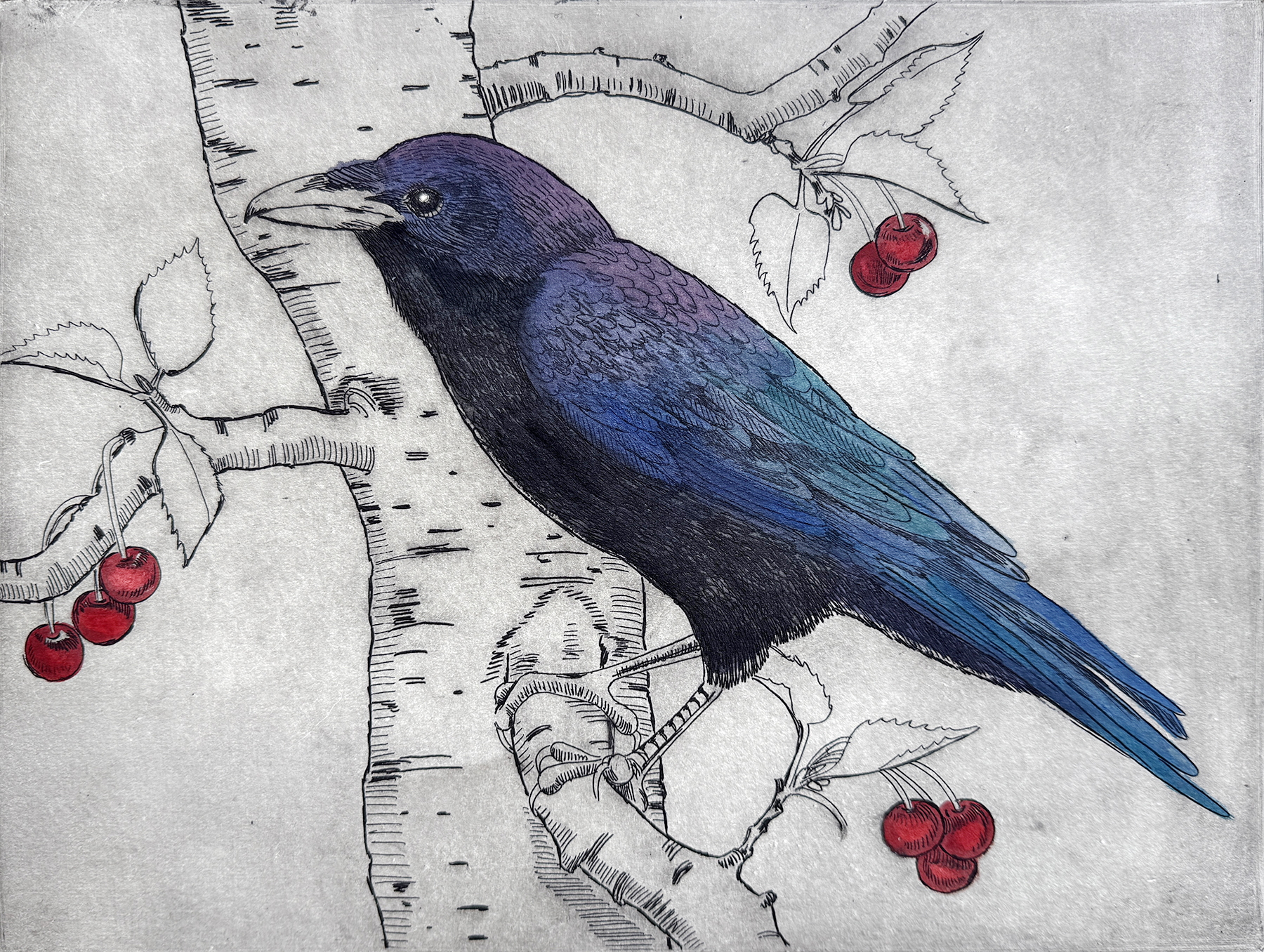 Art medium(s): 1. 2D work incorporating leather stretched over wood panels, stones and objects. 2. Encaustic: to “burn in.” I use hot wax and wax mixed with pigments. 3. Etching, black and white prints produced one at a time in limited editions and hand colored.