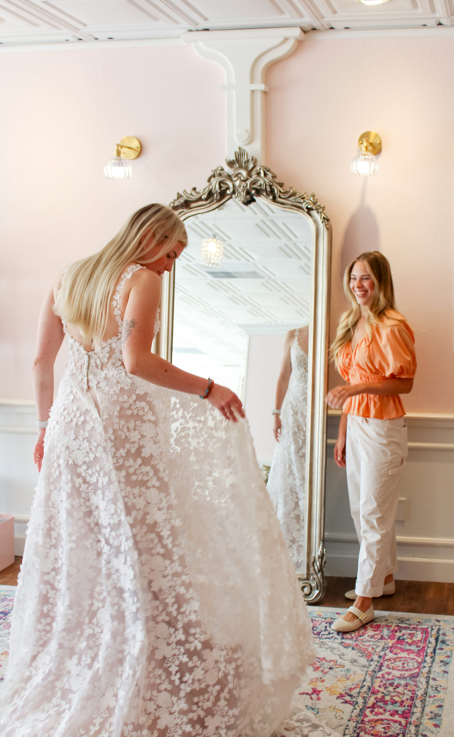LP: Do a little research before booking your appointments! Not every bridal boutique is created equal! Take time to make sure the stores you’re choosing carry a wide range of dresses within your budget, not just a few options, and that they sample gowns in your size or close to it. It’s also important to confirm that the designers and styles they carry actually align with your vision.
