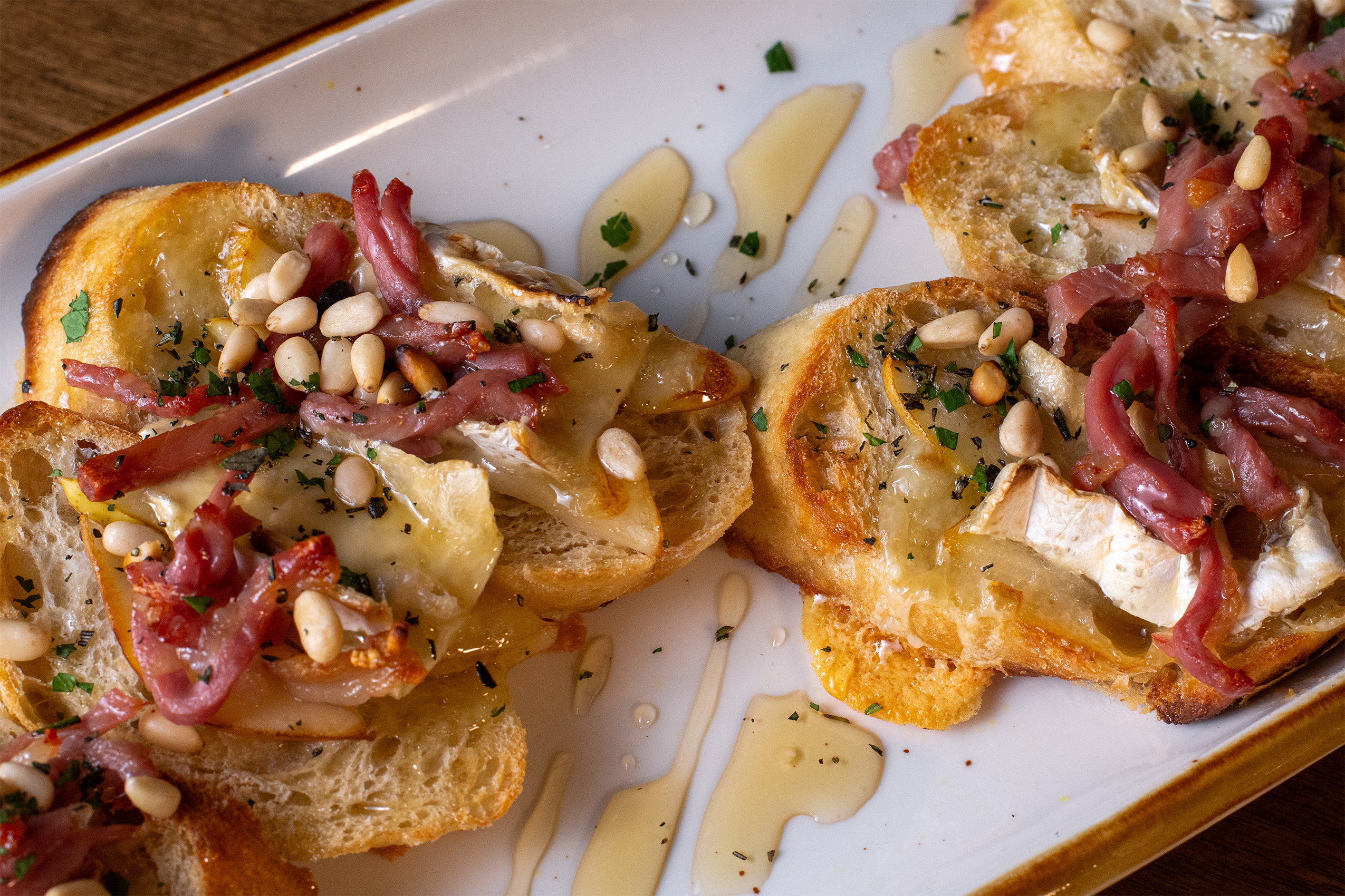 Prosciutto and Brie: Brie cheese on a sliced baguette with cooked, crispy prosciutto and sliced pear. We finish it with honey and pine nuts and fresh herbs.