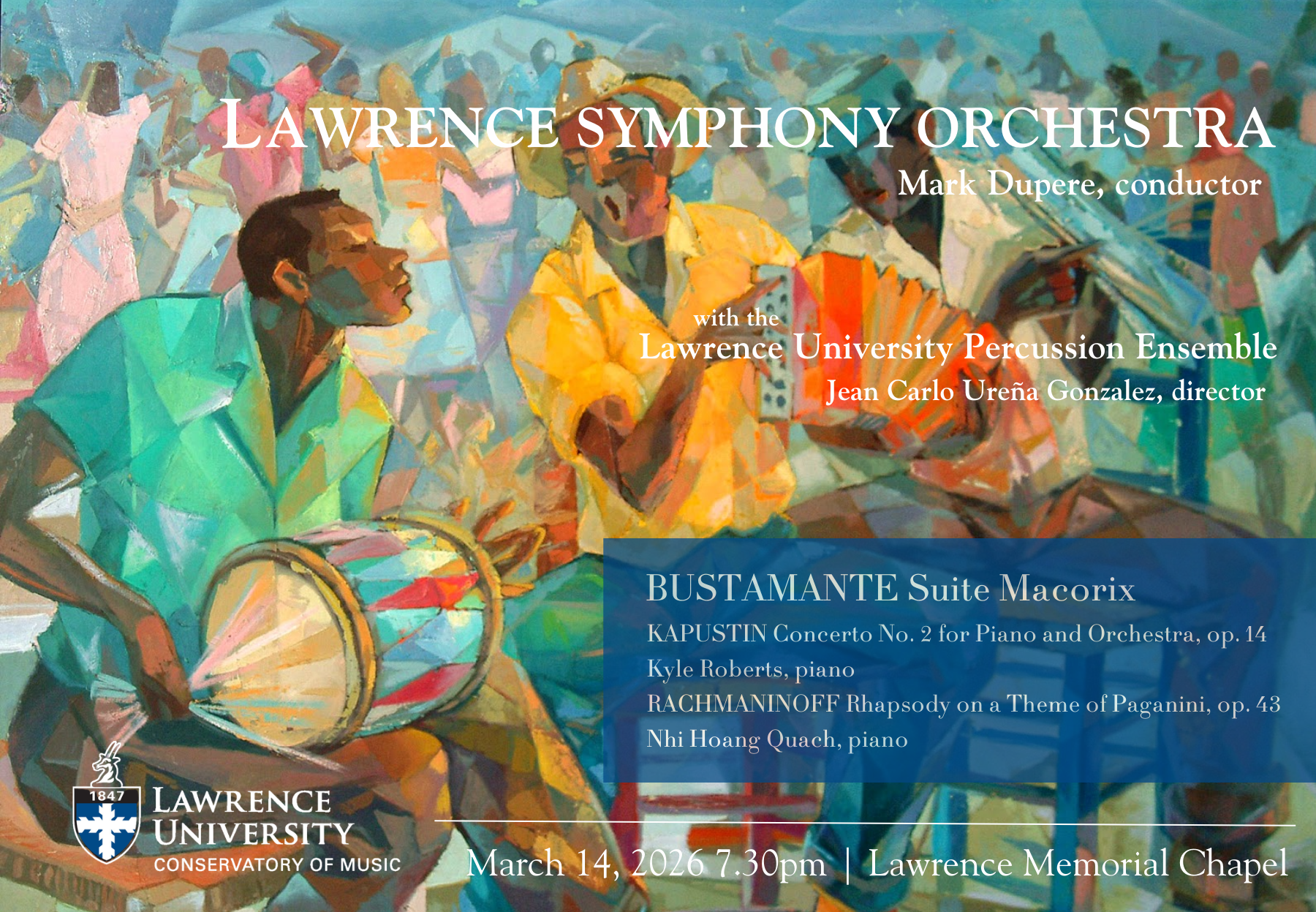Lawrence Symphony Orchestra’s winter term concert opens with Bienvenido Bustamante’s “Suite Macorix”, with the Lawrence University Percussion Ensemble. The concert also features pianists Kyle Roberts ’28 and Nhi Hoang Quach […]