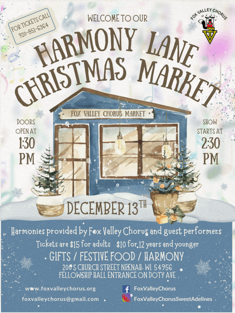 Celebrate the magic of the season with the Fox Valley Chorus at our festive Christmas Market & Show, filled with talent, laughter, and heart! Enjoy an afternoon filled with sparkling harmonies from the award-winning Fox Valley Chorus and our talented guest performers. Let your heart be lifted by your favorite holiday tunes, beautifully sung in the spirit of the season.